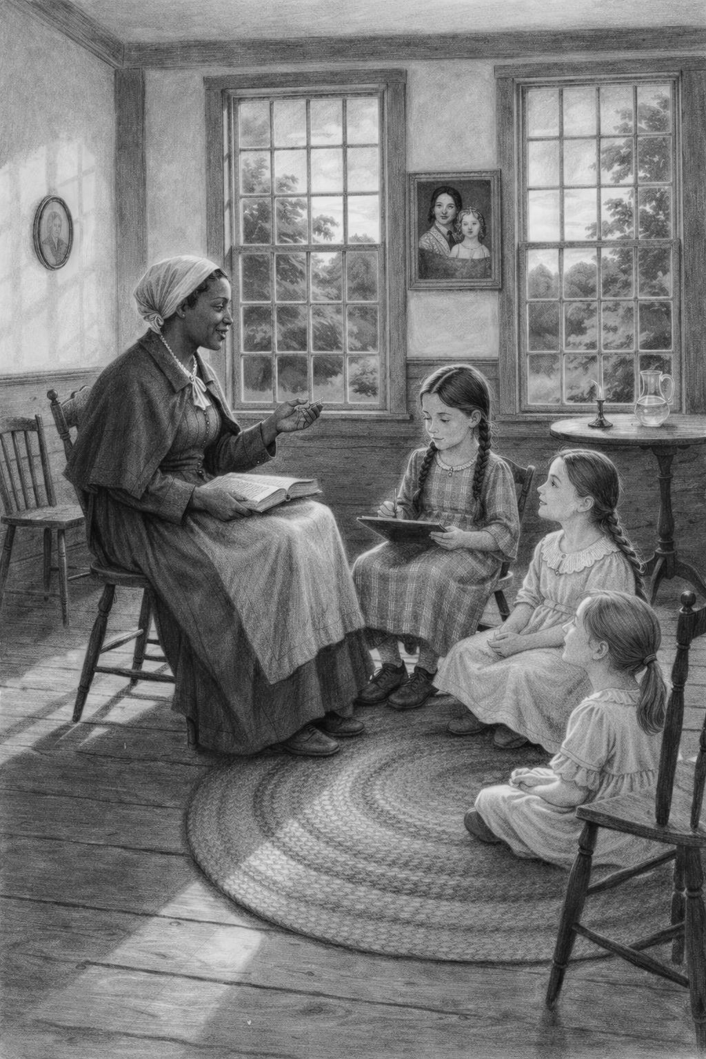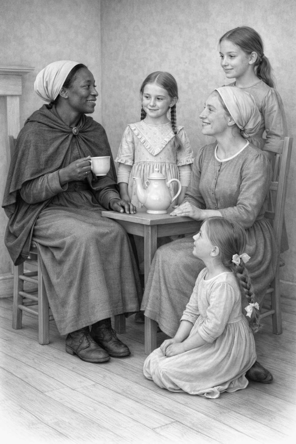 Many of the figures are grounded in historical sources. The mother in the story is based on her portrait from the 1850s, while the girls were developed using family descriptions, early photographs, and historical sketches. Whenever possible, the backgrounds use actual locations, including the Pownalborough Court House in Dresden, Maine, which still stands today and now serves as a museum.